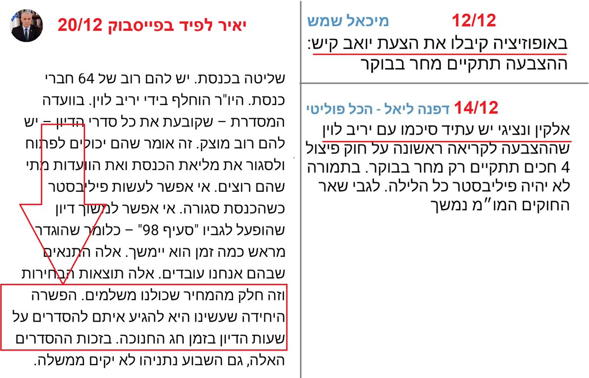 יאיר לפיד20/12/22על הסדרי דיונים בכנסת מול הקואלציה: "הפשרה היחידה שעשינו היא להגיע איתם להסדרים על שעות הדיון בזמן חג החנוכה"20/12/22בודקים: ב-12.12.2022 מיכאל שמש פרסם: "באופוזיציה קבלו את הצעת יואב קיש: ההצבעה תתקיים מחר בבוקר" ב14.12.2022 פרסמה דפנה ליאל: "אלקין ונציגי יש עתיד סיכמו עם עם יריב לוין שההצבעה...תתקיים רק מחר בבוקר"